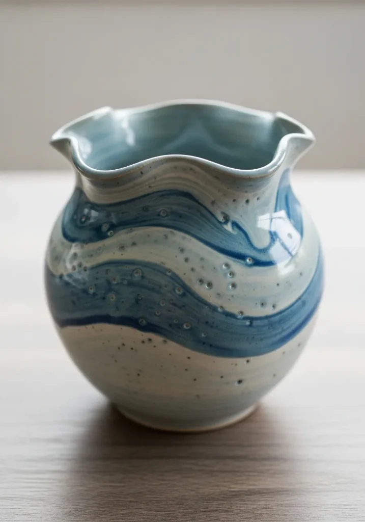This charming pitcher has a softly rounded body with a gently flared lip and a subtle spout. The glaze features flowing blue waves over a creamy white base, almost like watercolor captured in clay. The lines swirl naturally around the form, enhancing the curves rather than fighting them. The surface has that glossy, slightly uneven handmade finish that makes it feel special.