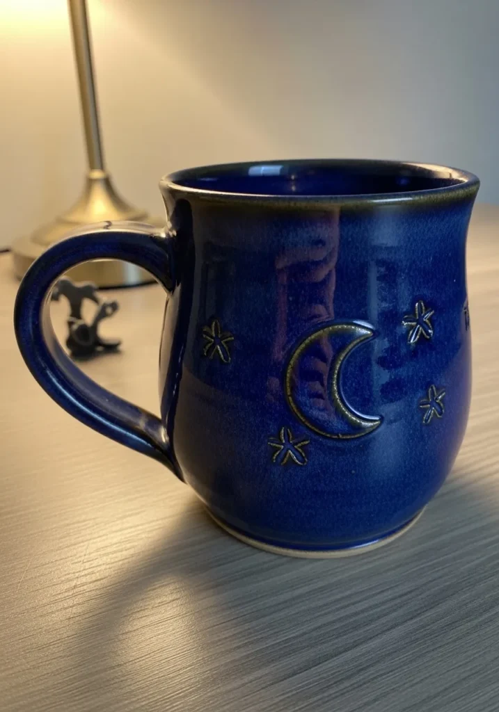This deep cobalt blue mug has a classic rounded cylinder shape with a smooth, comfortable handle. The surface is decorated with a raised crescent moon and tiny star details that gently catch the light against the glossy glaze. The rich blue color feels cozy and dramatic, while the slightly uneven rim reminds you it was shaped by hand on the wheel. The design is simple but magical, like a little piece of the night sky you can hold in your hands.