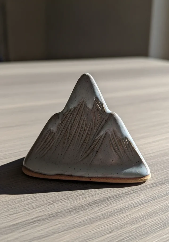 This small triangular dish is shaped like a stylized mountain peak, with subtle carved lines running down the sides to mimic natural ridges. The glaze is a soft matte gray that highlights the clean angles and simple geometry. The base is slightly rounded underneath, giving it a gentle lift while keeping the overall look modern and minimal. The smooth surface contrasts beautifully with the carved texture.