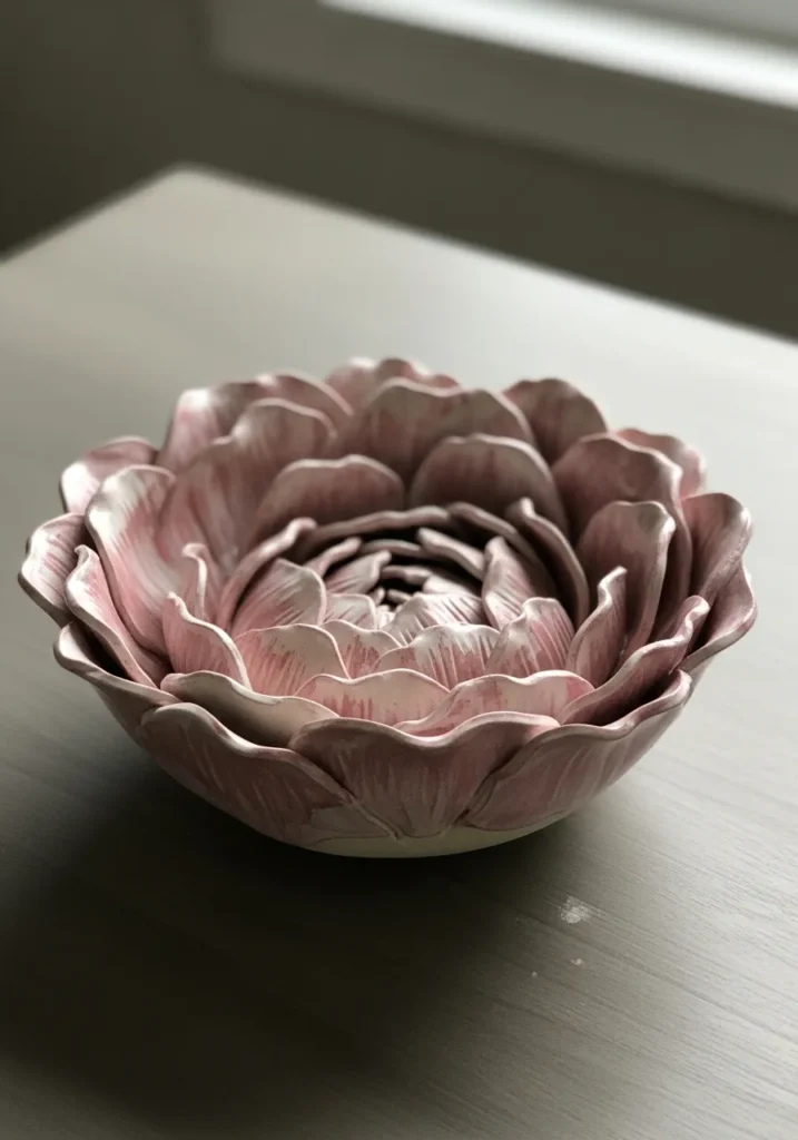 I adore floral shaped pottery because it feels both artistic and feminine without being over the top. Painting soft gradients on each petal is surprisingly relaxing, and the layered effect makes the finished piece look far more intricate than it actually is. It is one of those designs that instantly elevates a coffee table or vanity.