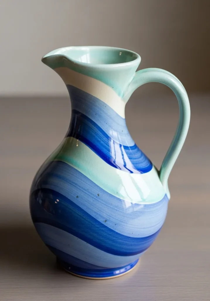 Painting abstract waves on pottery is one of my favorite ways to experiment with color blending. It feels expressive and freeing, and no two pitchers will ever look exactly the same. I love how something so practical can double as a decorative statement on a shelf or dining table. It instantly brings a breezy seaside vibe indoors.