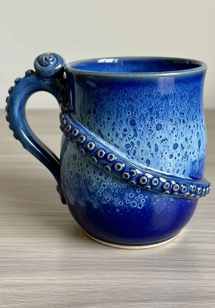 I am such a fan of experimenting with texture on pottery. This kind of design is perfect if you want something bold without painting tiny detailed images. Blending blues together is incredibly relaxing, and the raised details make it feel extra special. It is one of those mugs that instantly becomes your favorite.