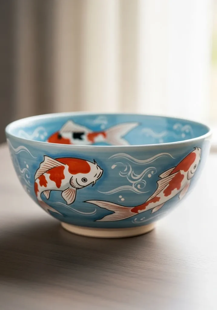 This beautiful ceramic bowl features graceful koi fish swimming across a sky blue background with soft white wave accents. The fish are painted in bright orange and white with gentle shading to show movement and flow. The glossy glaze enhances the colors, while the curved interior of the bowl makes the design feel dynamic and alive.