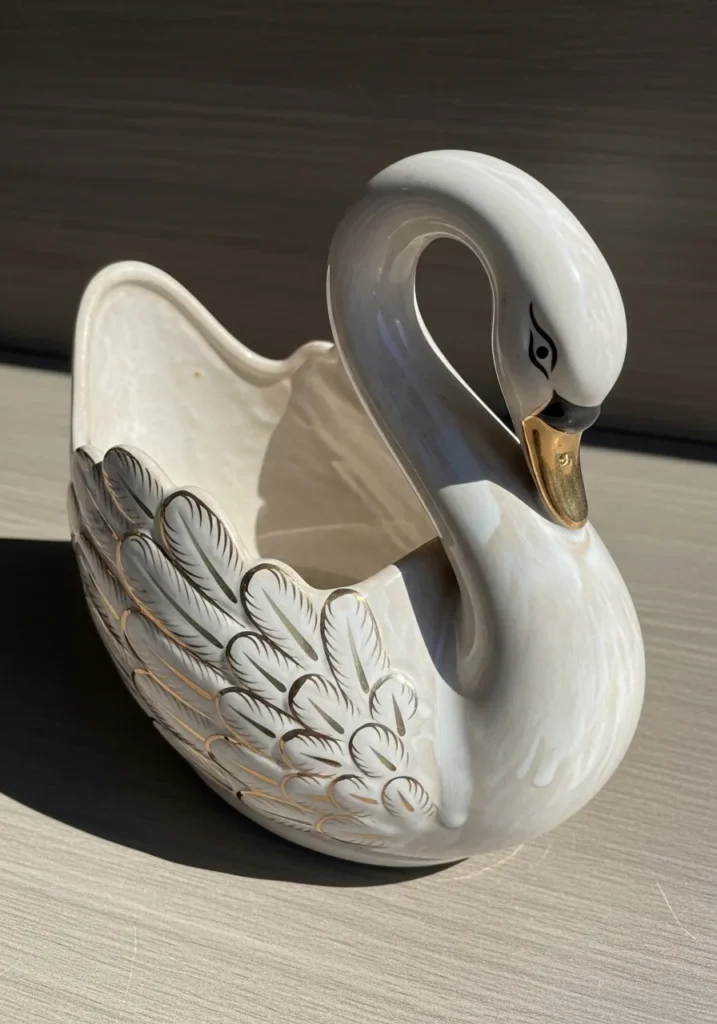 This graceful ceramic swan vase features a creamy white glaze with gentle gray shading along the wings. Fine feather details are carved into the surface, adding texture and dimension. The curved neck forms a beautiful silhouette, and the beak is finished in a subtle gold tone for a refined touch. The overall look is smooth, polished, and timeless.