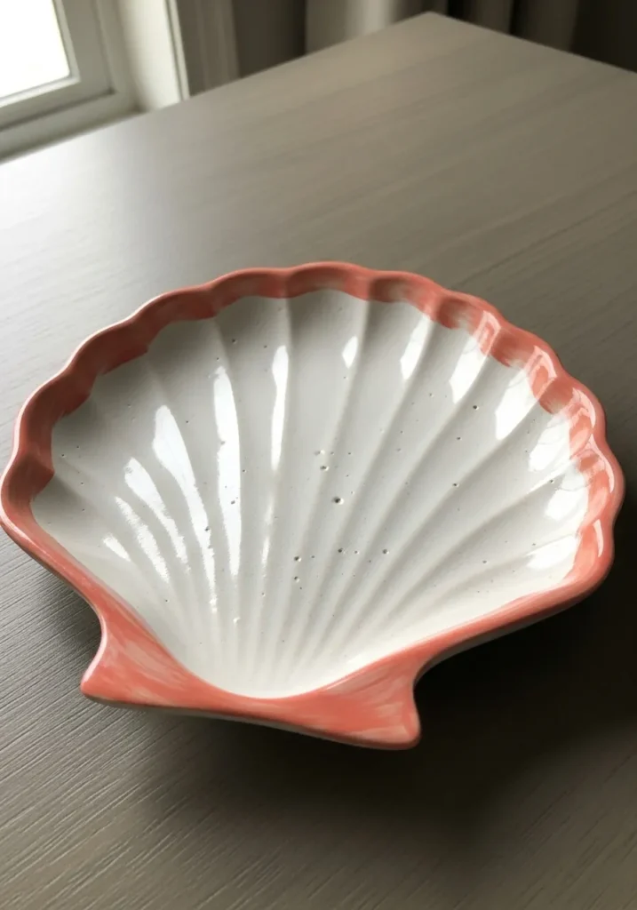 This elegant ceramic dish is shaped like a scallop shell with delicate ridges fanning outward from the base. The interior is painted in soft ivory, while the outer rim is finished in a warm coral pink for contrast. The smooth glaze highlights the curved lines and gives the piece a refined coastal charm.