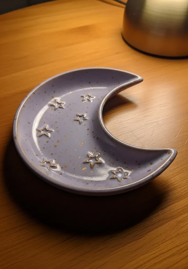 This pottery trinket dish is shaped like a clean crescent moon with tiny star details carved across the surface. The glaze is a soft muted lavender with lighter highlights that settle into the stars. The edges are gently rounded, giving it a polished but handmade look. It is compact and perfect for rings or small keepsakes.