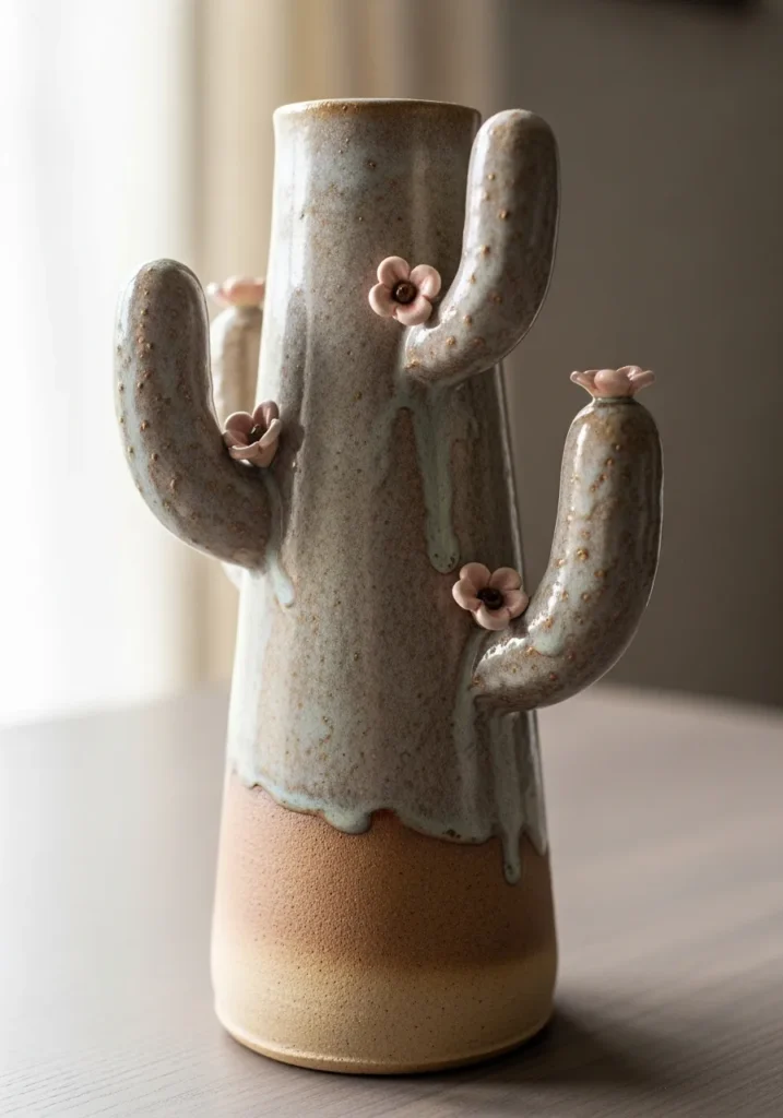 This pottery vase is shaped like a tall cactus with small raised arms branching from the sides. The glaze blends earthy beige at the base with a soft sage green on the upper half. Light texture marks mimic cactus ridges without overwhelming the form. The narrow opening keeps it functional for a few dried stems.