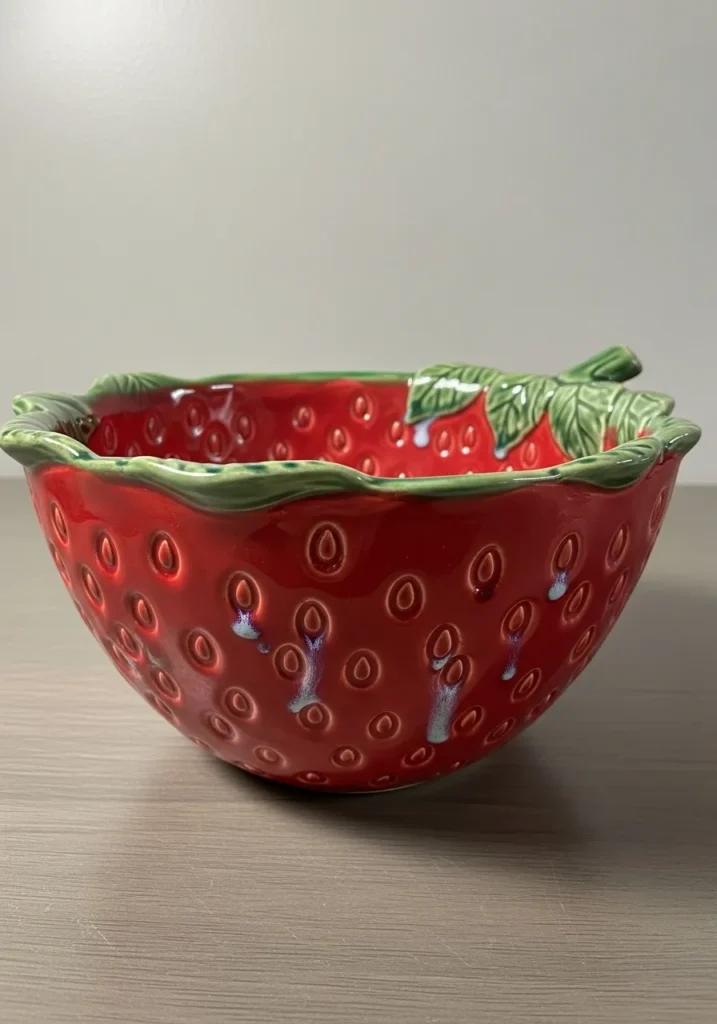 This bright pottery bowl is shaped like a large strawberry with tiny raised seeds scattered across the surface. The glaze is glossy red with a leafy green rim that frames the top. The inside remains smooth and bowl shaped, making it practical for snacks or fruit. It feels bold, cheerful, and totally fresh.