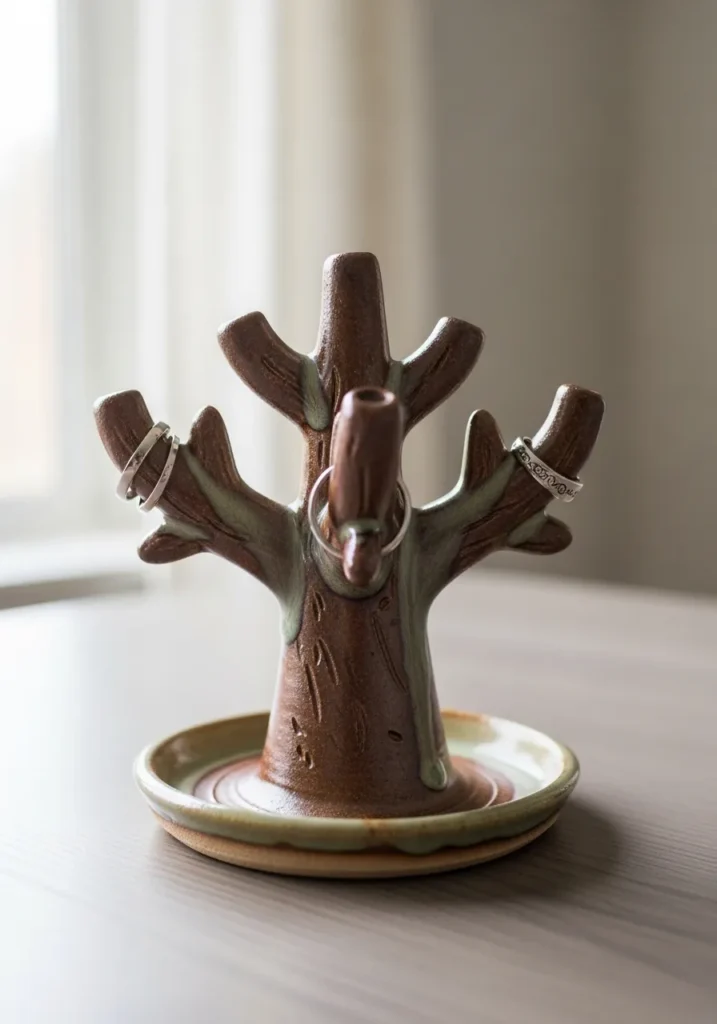 This pottery jewelry holder features a tree trunk base with several short branches extending upward. The glaze is a warm brown that highlights the natural carved bark texture. The base is flat and stable, designed to catch rings and small items. It feels rustic but modern at the same time.