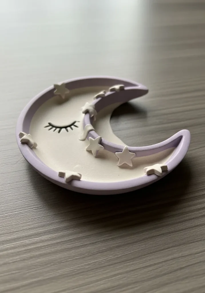 This dreamy crescent moon dish is sculpted from air dry clay with tiny raised stars and a sweet closed eye detail on the surface. The moon curves gently upward to form a shallow dish, perfect for holding rings or small earrings. It is painted in a soft lavender tone with subtle shading that adds depth while keeping the overall look delicate and calming.