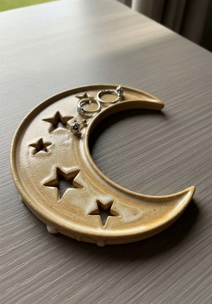 This crescent moon dish is made from smooth clay with star cutouts scattered across the surface. The neutral tone gives it a calm and dreamy look, while the shallow shape makes it perfect for rings or small treasures. The edges are softly rounded, keeping everything gentle and balanced.