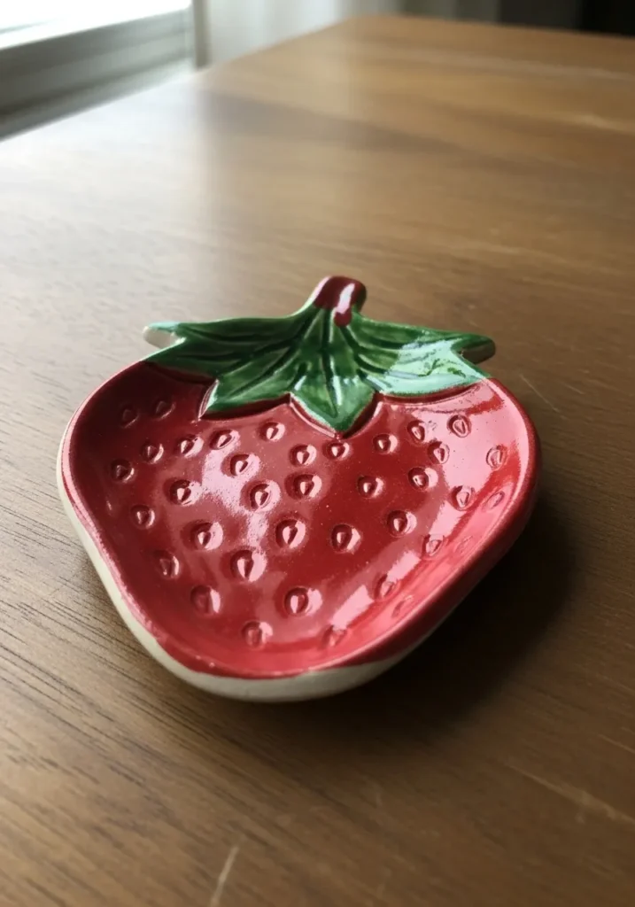 This adorable dish is shaped like a ripe strawberry with tiny textured seeds pressed into the surface. The glossy red finish and green leafy top give it a fresh and playful look. It works beautifully as a small snack plate or catchall tray.