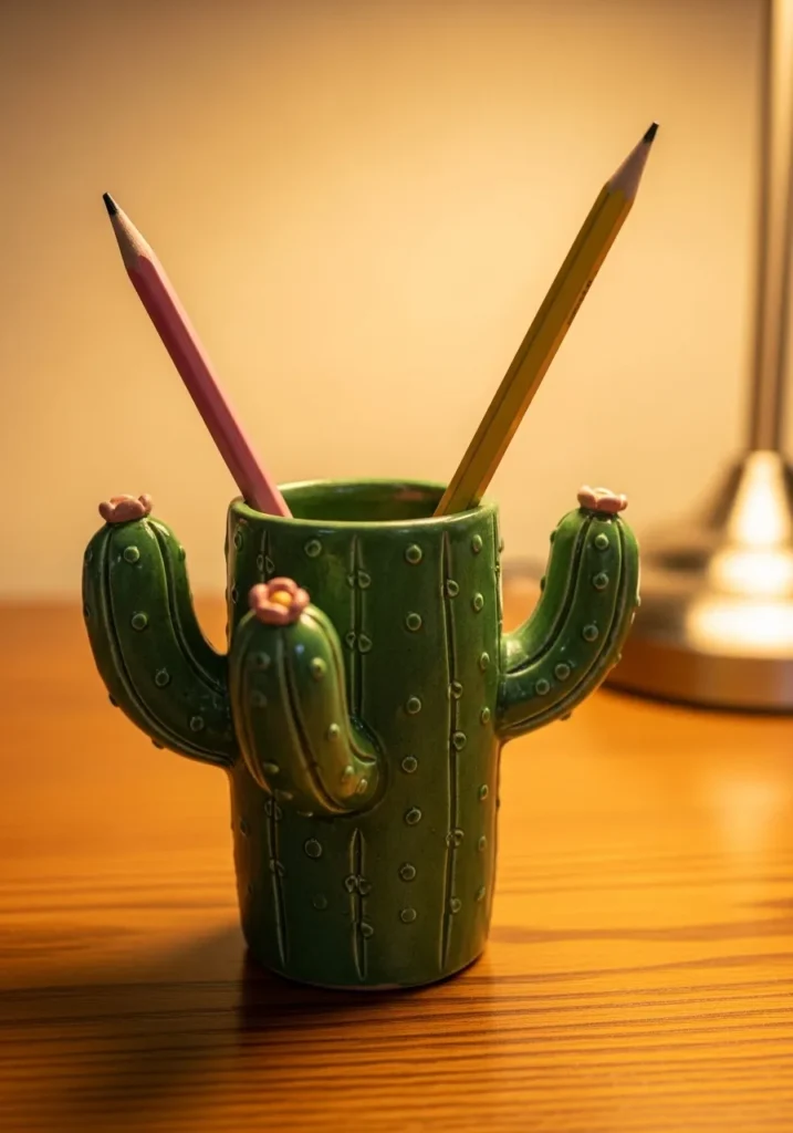 This clay pencil holder is shaped like a chunky cactus with raised arms and soft ridges. The green glaze gives it a playful plant inspired look, while the open top keeps it practical for pens or brushes. The finish feels smooth with subtle handmade texture.