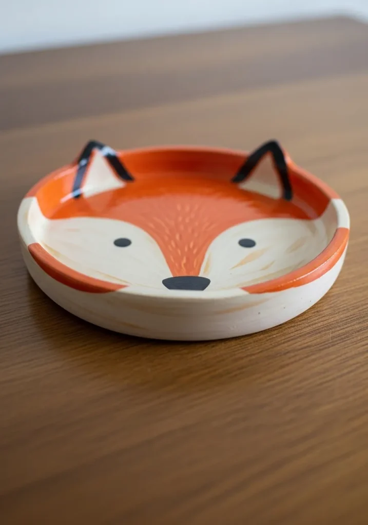 This small clay dish is shaped like a sweet fox face with pointed ears and soft painted details. Warm orange tones mix with creamy white accents, and the smooth glazed surface keeps it polished but still handmade. The shallow bowl shape makes it perfect for rings, keys, or tiny desk treasures.