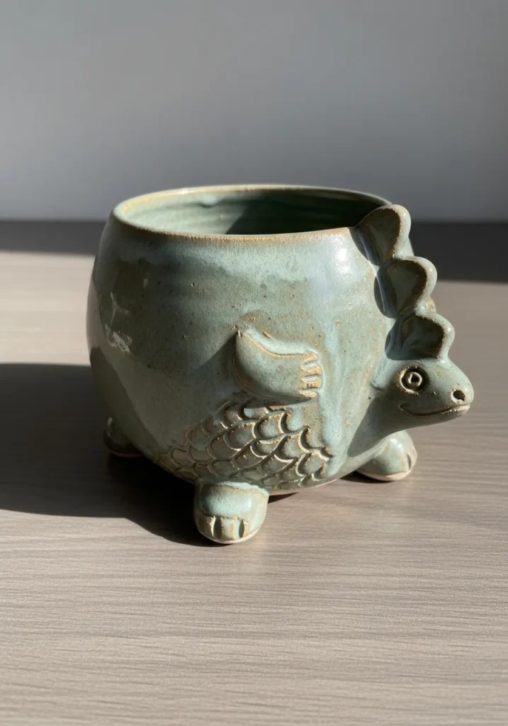 This hand built pottery piece features a rounded cup shaped like a tiny dragon, complete with sculpted wings, a curled tail handle, and sweet little feet that lift it slightly off the table. The glaze is a soft mossy green with subtle variations that pool darker in the carved details, giving it that earthy handmade charm. The surface has a slightly glossy finish, while the sculpted scales and wings add playful texture. It feels sturdy but still delicate, like a small fantasy creature turned into functional art.