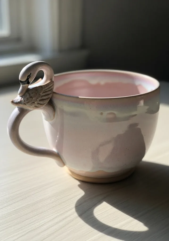 This elegant hand built pottery teacup features a sculpted swan forming the handle, its curved neck gracefully arching along the side. The cup is glazed in a soft blush pink with a glossy finish that catches the light beautifully. Subtle variations in the glaze add depth, while the swan detail brings a romantic touch. The interior has a smooth even coat that makes it perfect for tea or coffee.