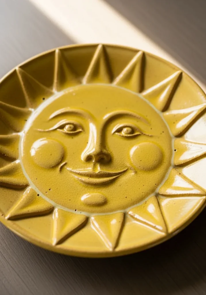 This hand built pottery plate features a sculpted sun face at its center, surrounded by pointed rays radiating outward. The glaze is a vibrant golden yellow with subtle depth in the carved facial details. The cheeks and eyelids are softly raised, adding dimension and character. The glossy finish catches the light beautifully and makes the piece feel bold and joyful.