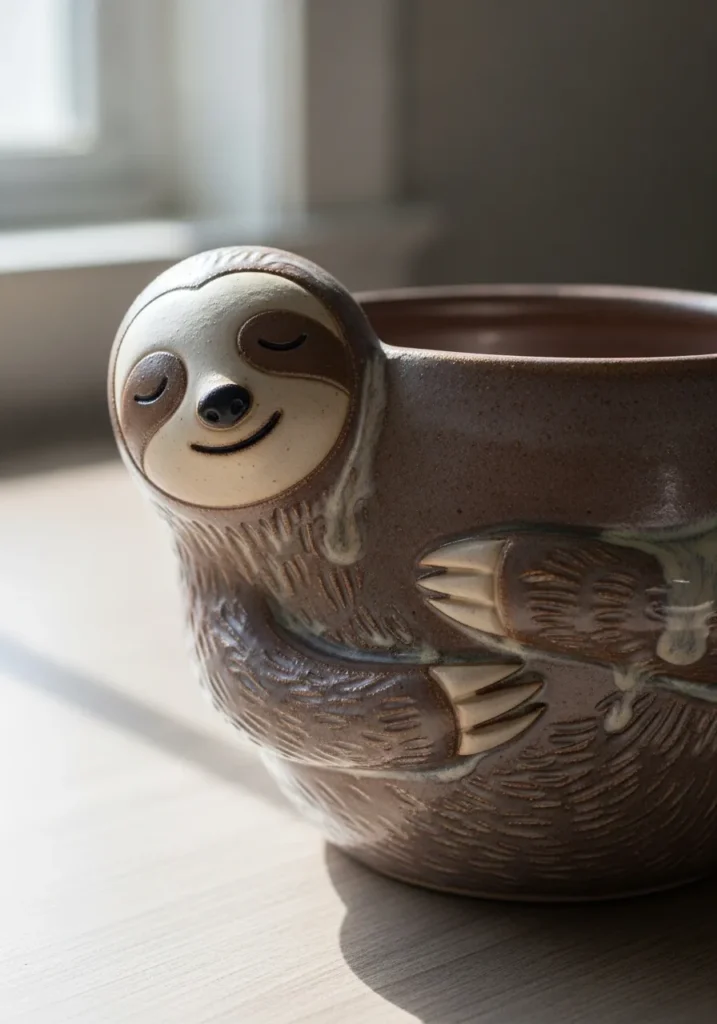 This hand built pottery planter mug showcases a sweet sloth clinging to the side, its tiny arms wrapped around the rounded form. The glaze blends warm browns and soft creams, with gentle texture carved into the fur. The interior is smooth and slightly glossy, making it practical for small plants or even as a cozy oversized cup. The sculpted face adds a soft and endearing touch.