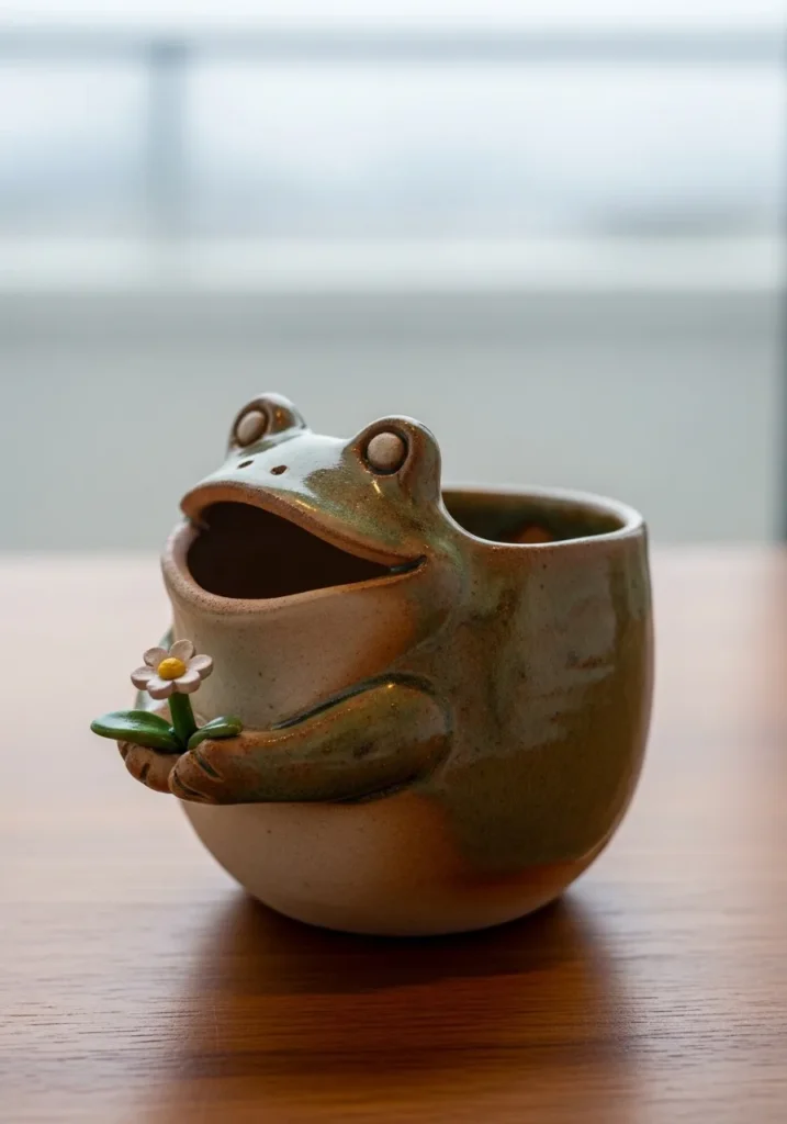 This clay planter is shaped like a happy frog with wide eyes, rounded cheeks, and a soft earthy glaze. The surface has gentle texture that keeps it feeling handmade, while the open top works perfectly for a small plant or succulent. The colors stay calm and natural, letting the playful shape stand out.