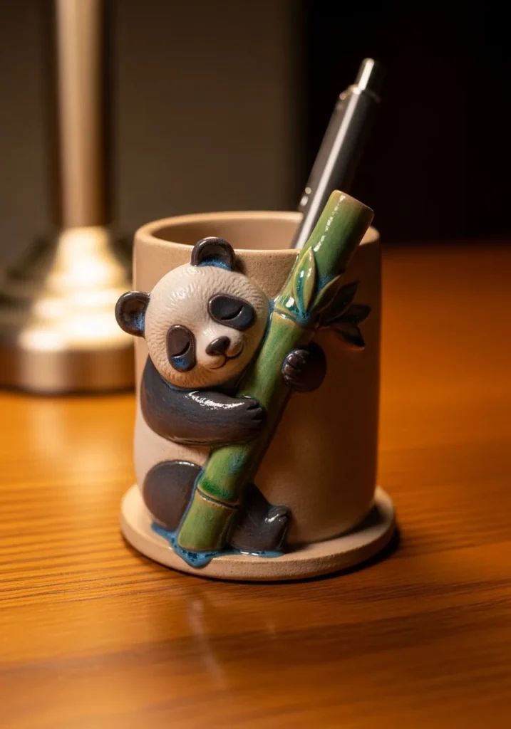 This clay pencil holder features a cute panda hugging a green bamboo stalk, with soft rounded shapes and gentle painted details. The neutral tones keep it calm, while the little character adds personality. The open top makes it practical for pens or brushes.