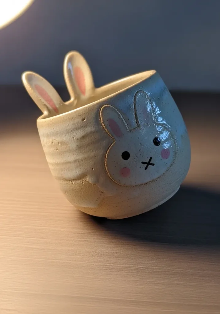 This clay cup features a sweet bunny face with raised ears and minimal painted details. The soft neutral glaze keeps it gentle and cozy, while the slightly uneven shape adds handmade warmth. It works well as a cup or small holder.