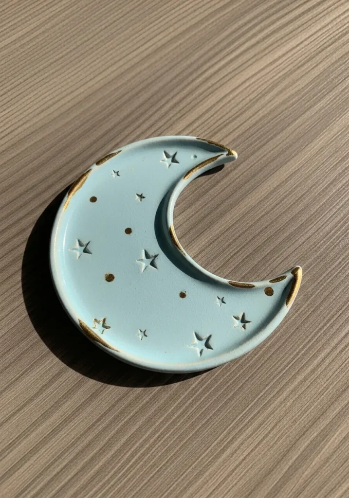 This crescent moon dish has a smooth curved shape with tiny star details scattered across the surface. The soft blue glaze feels calm and dreamy, with subtle variations that add depth. The shallow design makes it perfect for jewelry or small keepsakes.