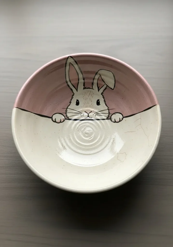 This adorable pottery bowl is divided into two soft tones on the inside, with a blush pink upper half and a creamy white lower half. A sweet little bunny is illustrated peeking over the color line, with simple black line details and tiny pink accents in the ears. The glossy glaze enhances the gentle contrast between the colors while keeping everything smooth and soft.