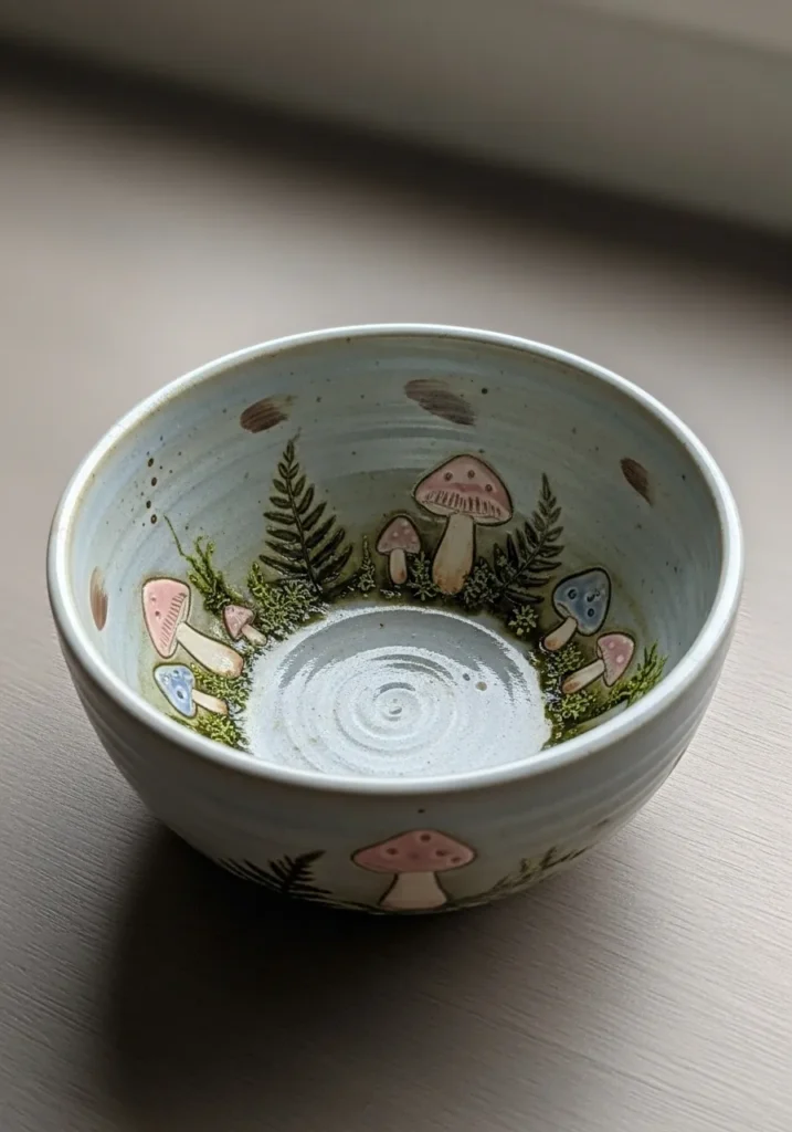 This charming pottery bowl features a pale sage background with hand painted ferns and tiny mushrooms wrapping around the interior. The mushrooms are done in soft blush and muted red tones with delicate white dots on the caps. Slender green fern leaves fill the space between them, creating a cozy woodland scene. The glossy finish enhances the layered greens and pinks while keeping the overall look gentle.