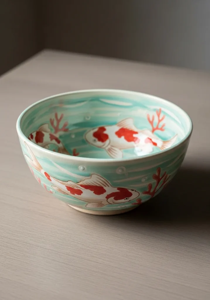 This pottery bowl is glazed in a fresh light aqua tone on the inside, creating the feel of clear shallow water. Hand painted coral branches in soft peach and gentle red tones wrap around the interior, with small fish swimming between them. The brushwork is delicate and slightly translucent, which keeps the design from feeling too busy. The outside remains neutral and matte, allowing the vibrant interior to stand out.