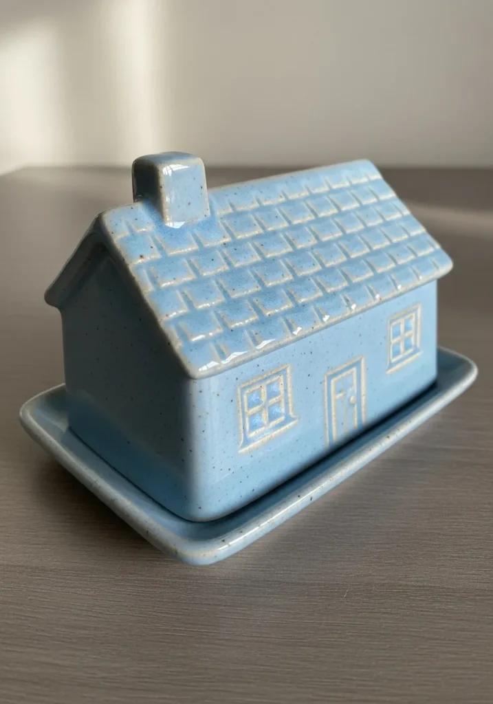 This charming ceramic butter dish is shaped like a tiny house with a matching tray underneath. The soft blue glaze covers the roof and walls, while subtle carved window and door details add depth. The roof tiles are gently textured, and the glossy finish gives the whole piece a clean, cozy feel. The base tray is simple and smooth, creating a sweet little foundation for the house shaped lid.