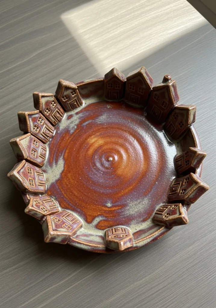 This striking ceramic bowl features a warm brown and amber swirl glaze in the center, almost like a tiny whirlpool. Around the rim, small sculpted house shapes form a circular village, each one detailed with simple roof lines and windows. The glaze transitions from earthy reds to creamy highlights, giving the piece a cozy handmade feel. The raised edges create texture and depth all around.