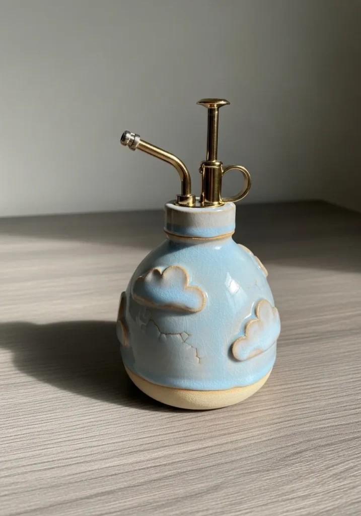This charming ceramic plant mister has a rounded body finished in a soft sky blue glaze. Raised cloud details wrap around the surface, adding a dreamy touch. The glossy ceramic contrasts beautifully with the metallic pump on top, which gives it a slightly vintage look. The bottom shows a hint of natural clay, grounding the piece with warmth.