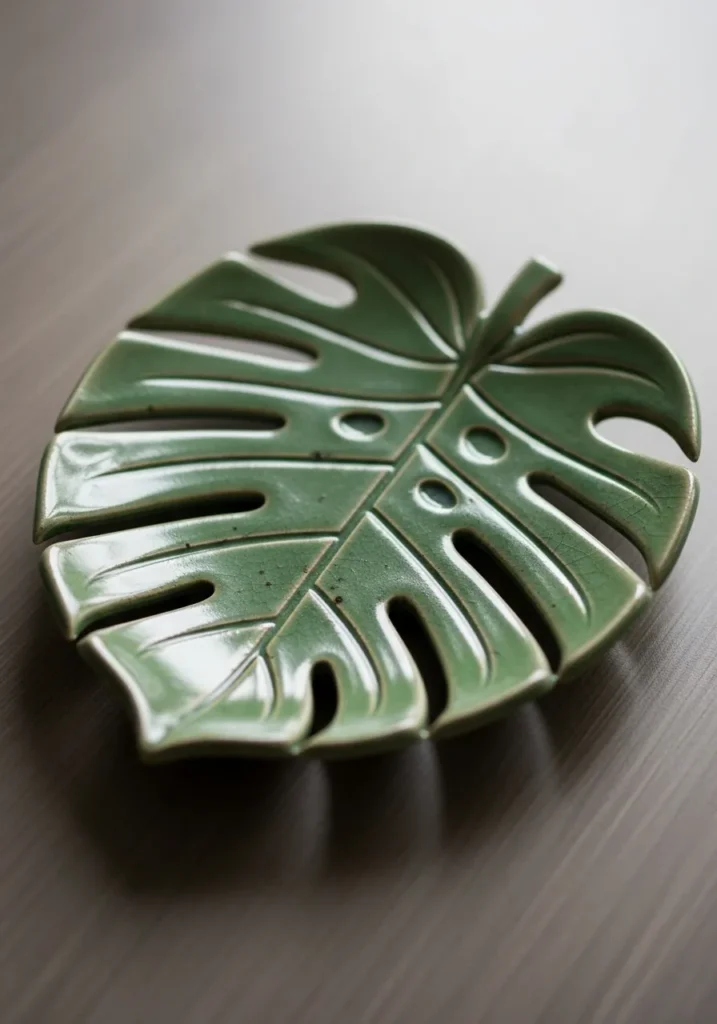 This glossy ceramic catchall is shaped like a tropical monstera leaf, complete with carved split details and smooth curved edges. The glaze is a rich leafy green with subtle variations that deepen near the veins, giving it a natural look. The surface has a soft shine that highlights the raised lines running through the center and out toward each cutout. Tiny speckles and faint glaze pooling add that perfectly imperfect handmade texture that makes it feel special.