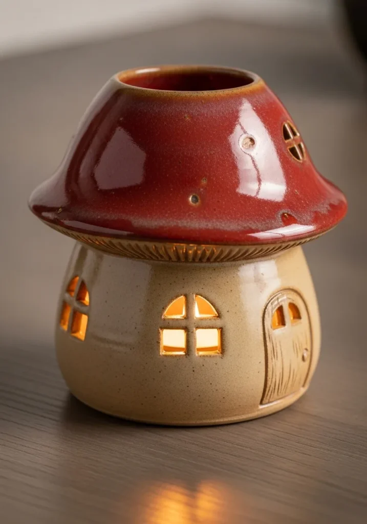 This sweet little mushroom house is crafted from hand shaped ceramic with a creamy beige base and a glossy red cap on top. Tiny cut out windows glow warmly when a tealight is placed inside, and the small door detail gives it a storybook feel. The red glaze on the roof has a soft shine, while the lower part remains more matte and earthy. The rounded shapes and slightly imperfect edges make it feel charming and whimsical.