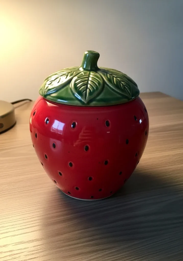 This bright strawberry jar is crafted from glossy red ceramic with tiny black seed details dotted across the surface. The green leafy lid sits snugly on top and is shaped with gentle texture lines to mimic real leaves. The body has a rounded, plump form that feels smooth to the touch, while the glaze gives it a vibrant shine. Small ventilation holes add both function and visual interest.
