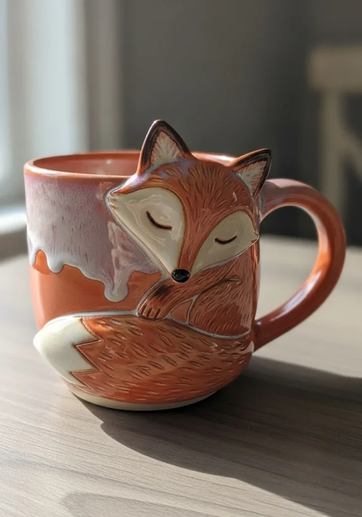 This adorable ceramic mug is shaped and painted to resemble a curled up fox wrapped around the body of the cup. The glaze blends warm orange tones with creamy white accents, especially around the rim where it looks like soft dripping icing. The fox tail curves gracefully along the base, while the handle keeps a classic rounded form for comfort. The glossy finish enhances the rich autumn colors and highlights the carved fur texture.