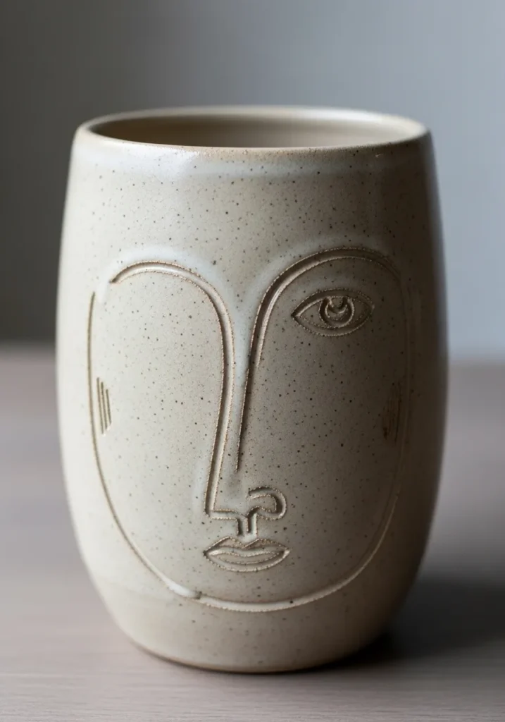 I love pieces like this because they turn a basic cup into something that feels like a tiny sculpture. It is the kind of project that really pushes wheel skills since you have to throw a clean, even form before adding the carved details. Adding facial features takes patience and confidence, but that is what makes it so satisfying. This is the type of pottery that feels modern, artsy, and totally Pinterest worthy all at once.