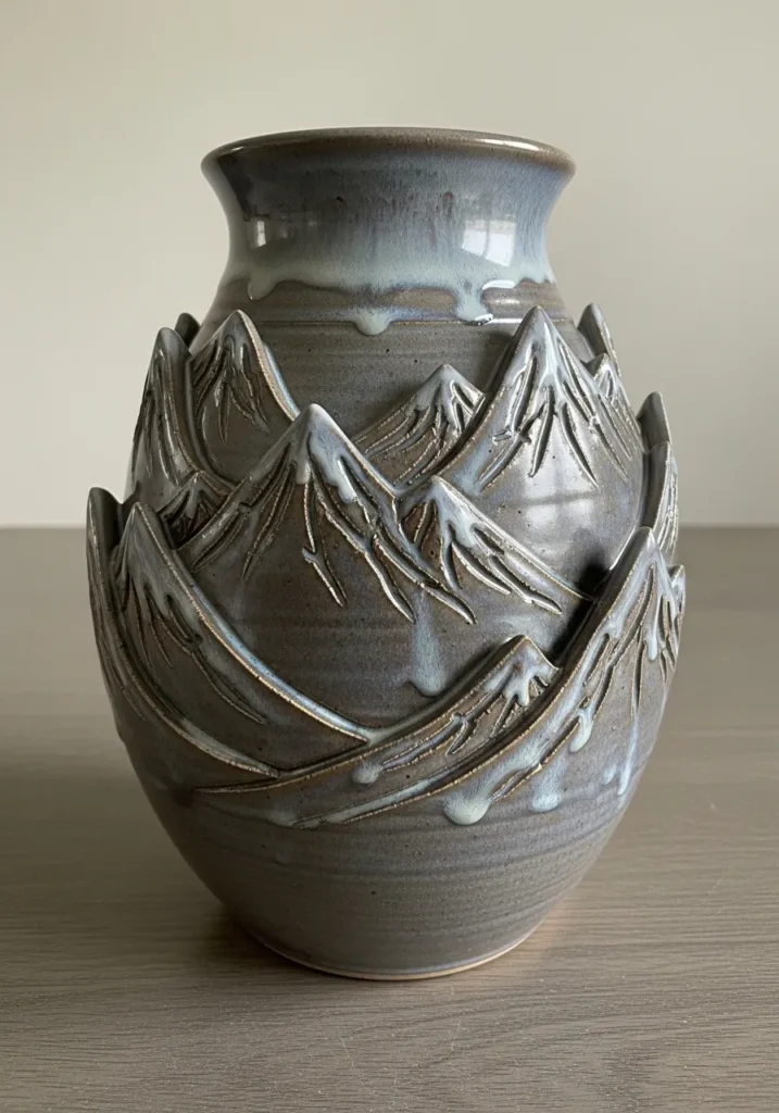 This tall pottery wheel vase features an intricate carved mountain scene wrapping around the body. The clay has been carefully carved to create layered peaks and flowing lines that suggest valleys and ridges. A soft grey glaze settles into the carved areas, emphasizing depth and texture while leaving the raised sections slightly lighter. The overall look feels calm, earthy, and beautifully detailed.