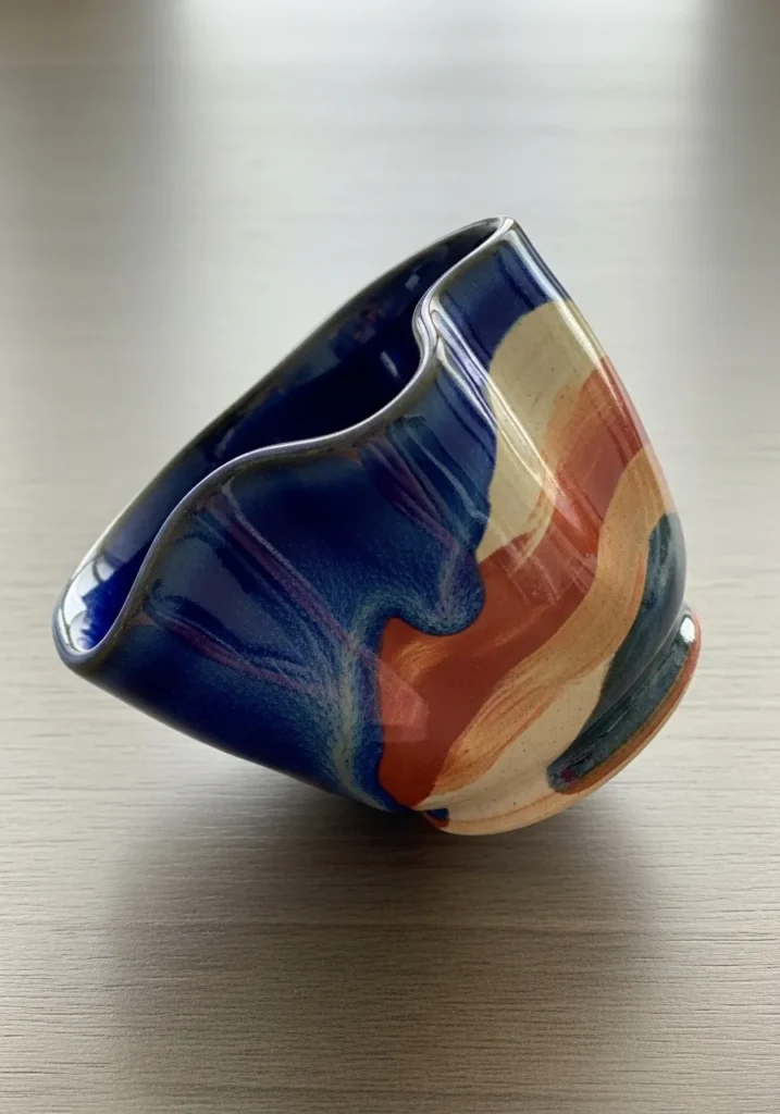This modern pottery wheel bowl leans heavily into expressive glazing. The shape is simple and slightly angled, but the surface steals the show with bold swirls of deep navy, warm rust, and creamy beige. The glaze flows organically across the surface, creating a painterly effect that feels almost like a landscape at sunset. The glossy finish enhances the movement and color variation.