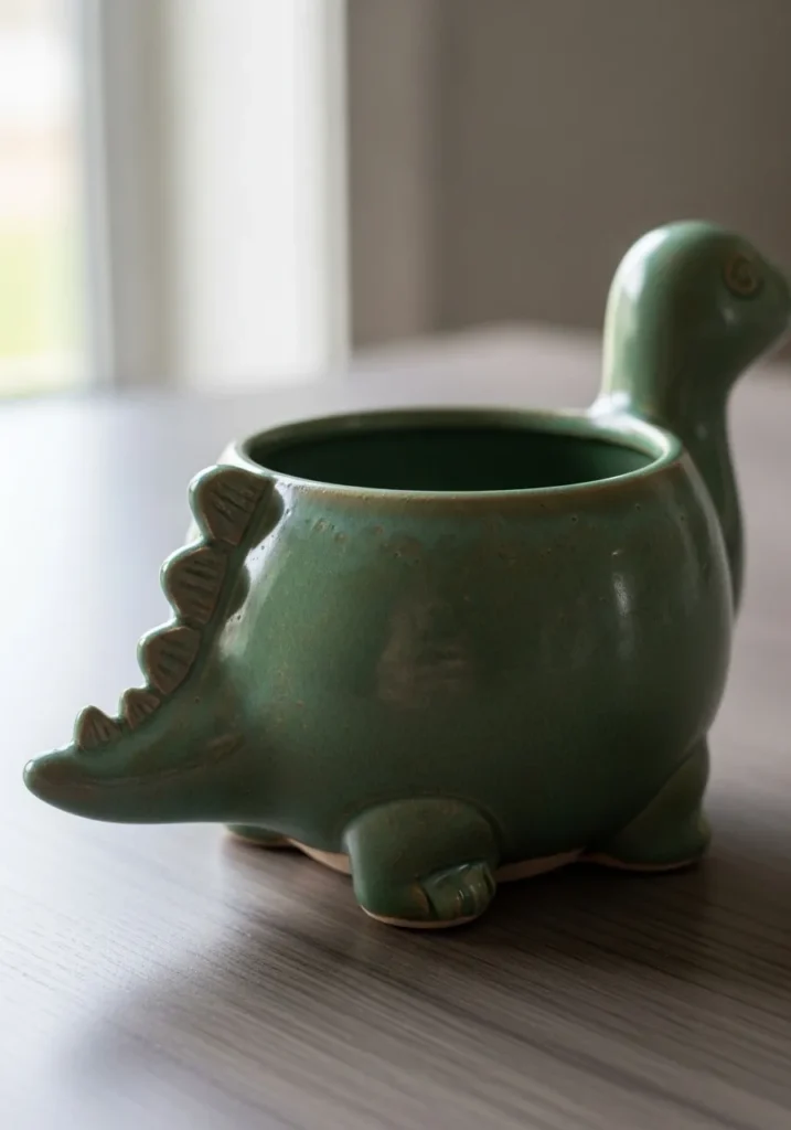 This playful pottery wheel planter transforms a simple round form into a chubby little dinosaur. The body is thrown as a bowl, then sculpted with tiny legs, a curved tail, and soft ridges along the back. The glossy sage green glaze enhances the friendly look and gives it a smooth, almost toy like finish. The open top is wide enough for a small plant, making it both adorable and practical.