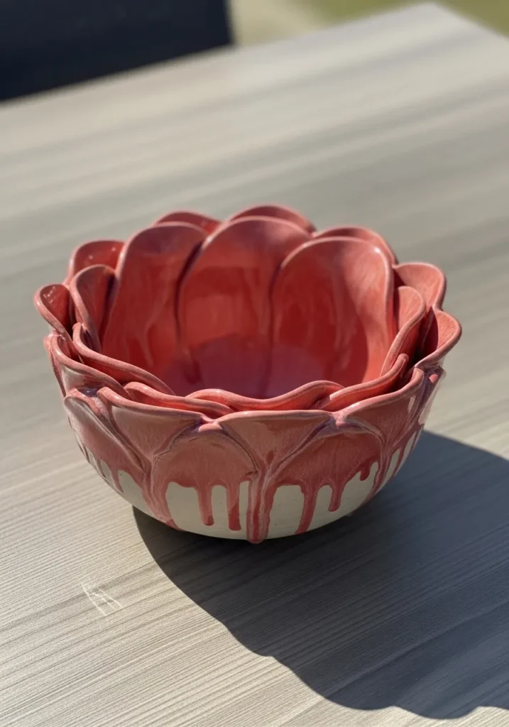 This modern pottery wheel bowl is shaped like a blooming flower, with softly curved petal edges that rise and fold outward. The glaze is a rich glossy coral pink that pools slightly in the creases, creating beautiful depth and natural variation. The inside has a smooth finish while the outer base remains simple and slightly matte, giving it contrast and balance. The organic shape feels sculptural but still functional enough for serving snacks or displaying small items.