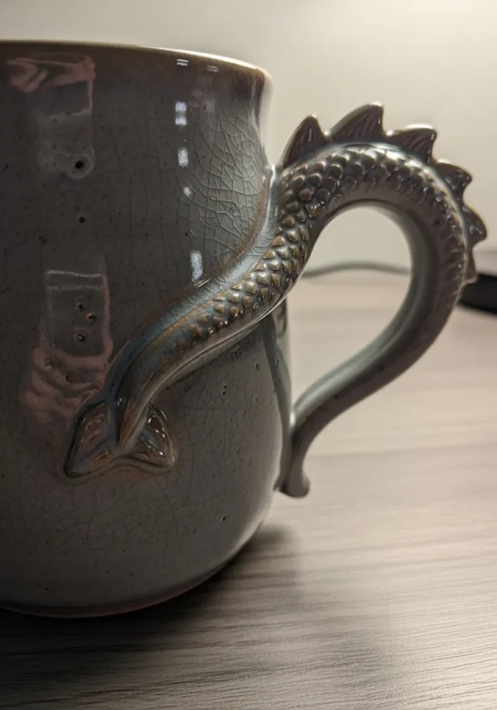 This dramatic pottery wheel mug starts with a classic cylindrical body in a deep charcoal glaze. The real showstopper is the sculpted dragon handle that wraps from rim to base, with textured scales and a curved tail that forms the grip. The glossy glaze enhances the details in the sculpted handle, while the body remains smooth and slightly reflective. It feels like a mix of fantasy and modern craftsmanship in one functional piece.