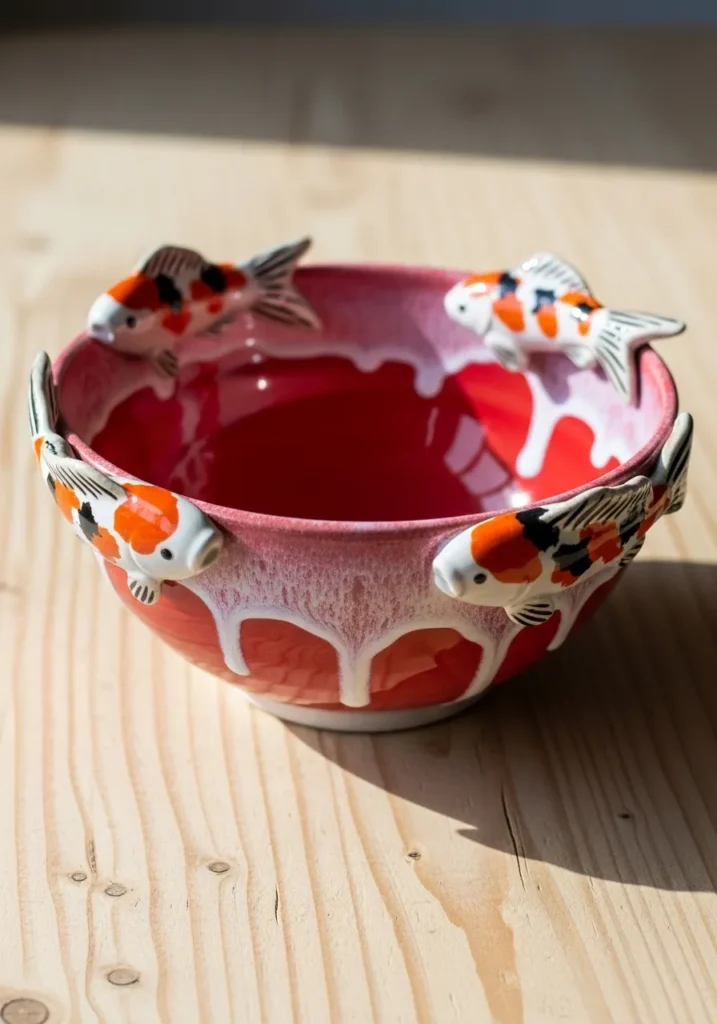 This vibrant pottery wheel bowl features a glossy red interior that feels bold and playful. Around the rim, tiny sculpted koi fish swim in raised detail, each carefully attached and glazed in soft white, orange, and black accents. The glaze drips slightly along the inner edge, giving it a fluid, water inspired feel. The contrast between the bright red base and the delicate fish details makes the whole piece feel alive and dynamic.