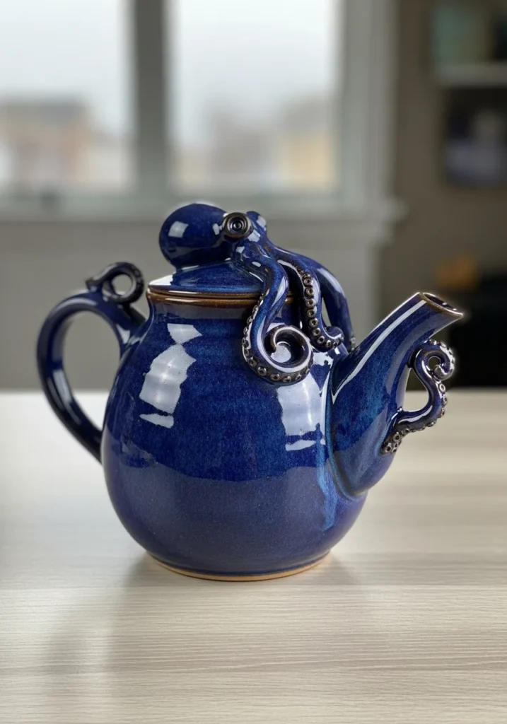 This rich cobalt blue teapot is such a showpiece. The body is thrown round and full, then detailed with sculpted octopus tentacles that wrap around the surface and form part of the handle. The glossy glaze pools in the curves of the tentacles, highlighting their texture and movement. The spout and lid are smooth and balanced, keeping the piece functional despite its dramatic details.