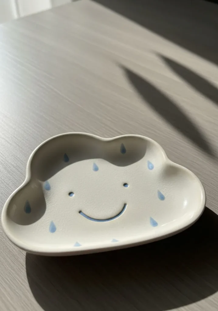 This adorable ceramic trinket dish is shaped like a soft, puffy cloud with gently rounded edges and a slightly raised rim. The surface features a simple smiling face pressed into the clay, paired with tiny hand painted blue raindrops scattered across a creamy white glaze. The finish has a lightly crackled texture with subtle glaze variations that give it a handmade feel. Its shallow form makes it perfect for holding rings, earrings, or small everyday treasures while still looking like a cute decor piece on a wooden surface.
