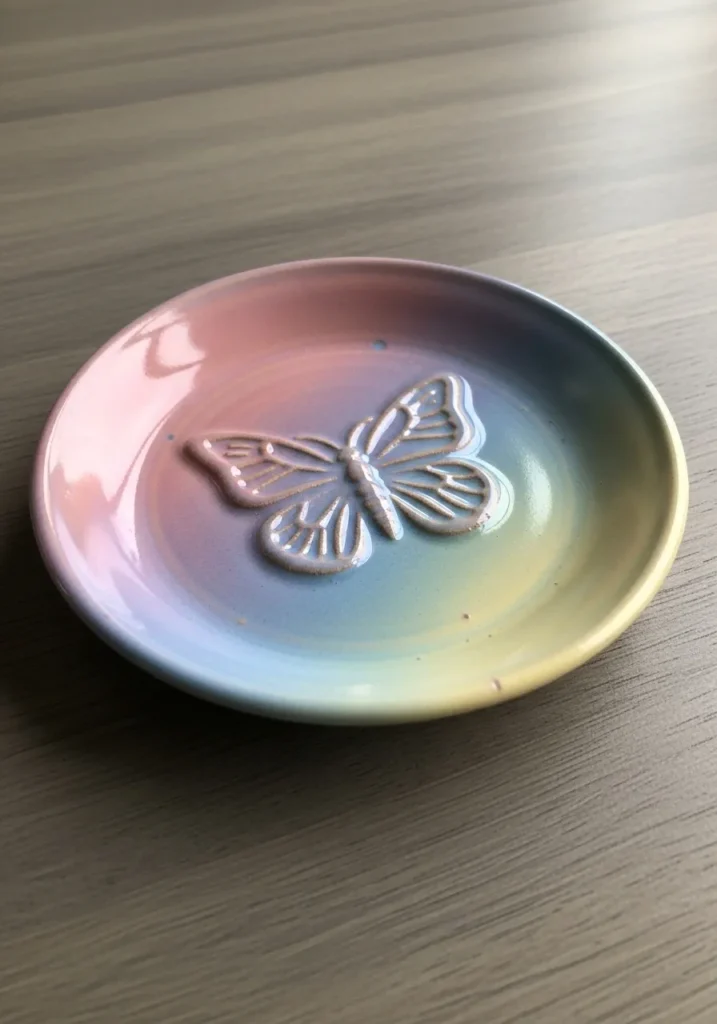 This delicate ceramic dish features a softly rounded shape with a raised butterfly design resting at the center. The glaze blends dreamy pastel tones like blush pink, soft blue, and hints of lavender, creating a smooth gradient effect across the surface. The butterfly details are gently embossed, with fine lines outlining the wings and body. Subtle glaze variations and tiny speckles add a natural handmade touch, while the glossy finish gives it a light reflective shine.