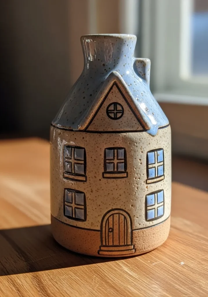 This charming ceramic vase is shaped like a tiny storybook house, with a soft rounded body and a gently sloped roof forming the neck. The surface features hand drawn windows and a small arched door, outlined in dark lines that stand out against the warm speckled clay. A glossy glaze drips lightly from the roof, adding texture and a cozy handmade feel. The combination of earthy tones and subtle shine gives it a sweet rustic look.