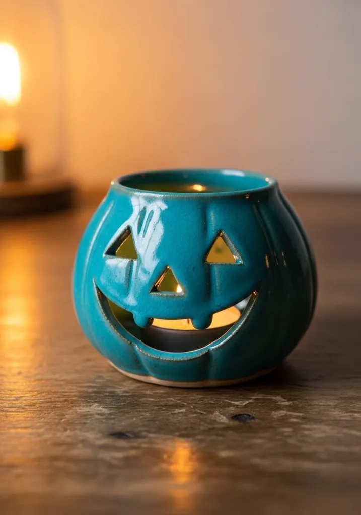 This ceramic candle holder is shaped like a cheerful pumpkin with a rounded body and softly carved ridges that mimic its natural form. The glossy teal glaze gives it a fun twist on the classic look, while the carved face with triangle eyes and a wide smile lets warm light shine through. Subtle glaze pooling around the edges and tiny surface variations add that handmade charm. The open top holds a small candle, creating a cozy glow that highlights every little detail.