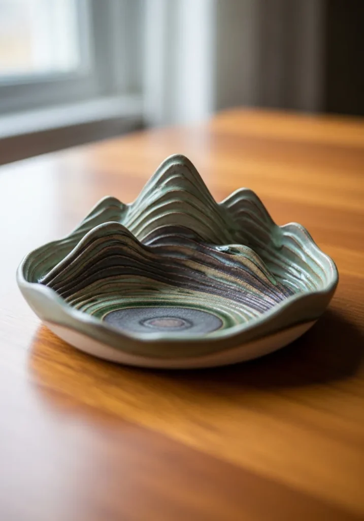 This striking ceramic dish is designed with raised layers that resemble a miniature mountain landscape, creating depth and movement across the surface. The glaze blends earthy greens, deep browns, and soft blues that flow together in gentle gradients, highlighting each ridge and curve. The edges are slightly wavy, adding to the organic feel, while subtle texture variations and glaze pooling give it that beautifully imperfect handmade finish.