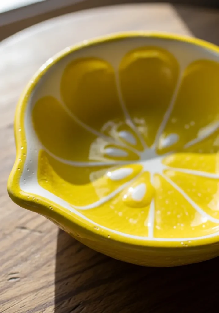 This cheerful ceramic bowl is shaped like a juicy lemon slice, with gently curved edges that mimic the natural form of citrus. The glossy yellow glaze fills each segment, separated by soft white lines that create that fresh cut look. Tiny speckled details and slight glaze pooling around the edges give it a realistic handmade finish. The surface feels smooth and vibrant, while the slightly uneven rim adds to its charm.